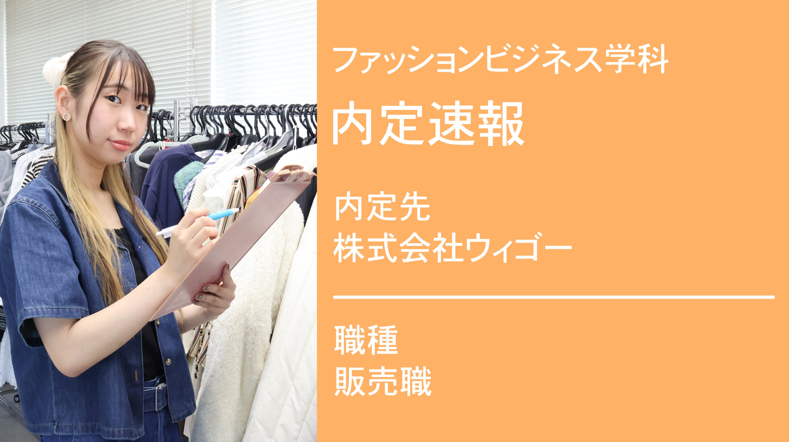 2025.01.01 株式会社ウィゴーに内定 -総合職- コメントこの2年間で、TGCや関西コレクション、メイクコンテストへの参加、自作衣装でランウェイを歩くなどたくさん経験することができました。私自身がアパレル業界を志したきっかけであるブランドで、次は私がファッションの魅力や楽しさを多くの人に発信していきたいです。 内定先株式会社ウィゴー 一覧へ カテゴリー Webクリエイター オープンキャンパス コラム トピックス ファッションクリエイター ファッションクリエイター・ファッションビジネス ファッションビジネス メディアギャラリー 内定速報 内定速報 最近の投稿 1月2月オープンキャンパス情報 ファッションビジネス学科によるポップアッ... スペシャルオープンキャンパス「一粒萬倍見... 「110番の日」1日通信指令課長に任命! 2026年3月卒業予定者内定速報 アーカイブ 2026年2月 (1) 2026年1月 (5) 2025年12月 (3) 2025年11月 (2) 2025年10月 (3) 2025年9月 (1) 2025年8月 (1) 2025年7月 (1) 2025年6月 (1) 2025年5月 (1) 2025年4月 (1) 2025年3月 (2) 2025年2月 (4) 2025年1月 (16) 2024年12月 (4) 2024年11月 (5) 2024年10月 (10) 2024年9月 (4) 2024年8月 (6) 2024年7月 (9) 2024年6月 (6) 2024年5月 (6) 2024年4月 (9) 2024年3月 (12) 2024年2月 (7) 2024年1月 (6) 2023年12月 (1) 2023年11月 (3) 2023年10月 (6) 2023年9月 (5) 2023年8月 (10) 2023年7月 (6) 2023年6月 (6) 2023年5月 (2) 2023年3月 (6) 2023年2月 (6) 2023年1月 (1) 2022年12月 (1) 2022年10月 (1) 2022年7月 (5) 2022年6月 (3) 2022年5月 (3) 2022年4月 (4) 2022年3月 (4) 2022年2月 (8) 2022年1月 (9) 2021年12月 (5) 2021年11月 (9)