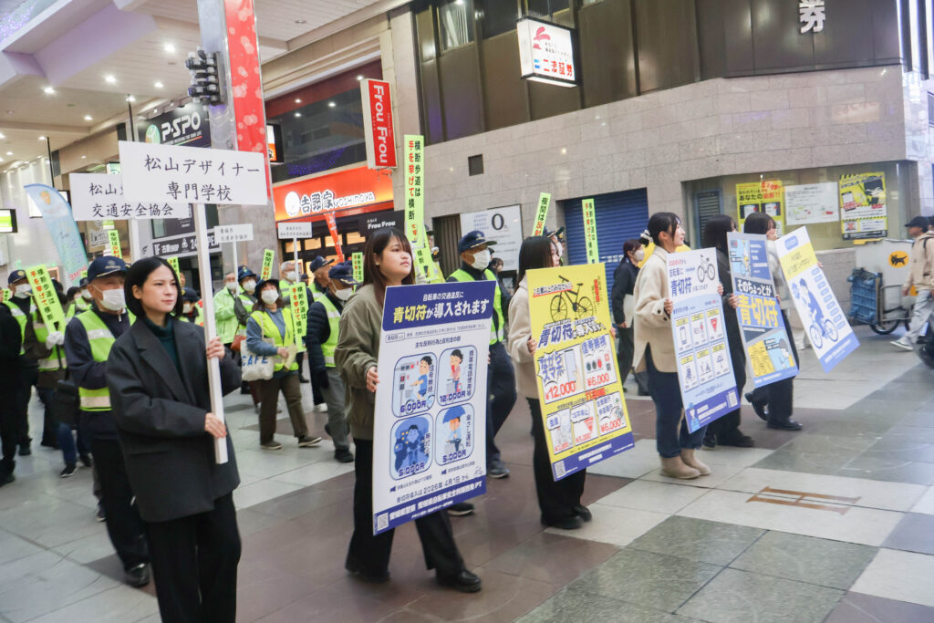 松山市大街道にて関係者団体約200人が参加した「交通安全啓発パレード」にWebクリエイター学科の学生が制作したポスターを持って参加しました。