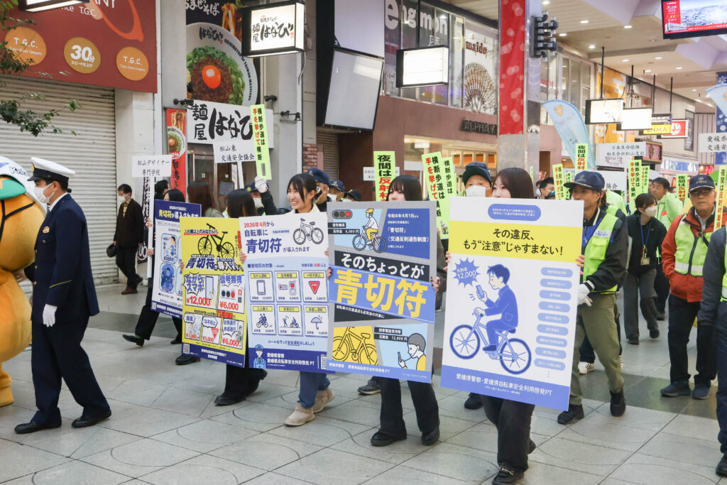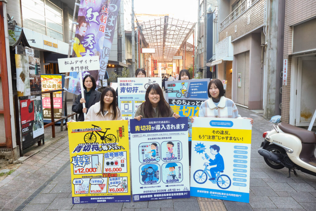 愛媛県警からの依頼で4月から導入される自転車の交通違反に対する【青切符】制度の啓発ポスターを制作したWebクリエイター学科の学生は作品を見せながら交通安全について呼びかけしました。